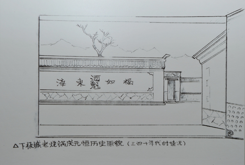 關(guān)闊去日本時(shí),發(fā)現(xiàn)了日本專門(mén)研究承德的學(xué)者伊東佑信先生早年在承德畫(huà)的速寫(xiě)里,有兩幅1940年前后的下板城老燒鍋慶元亨的實(shí)景記錄,非常真實(shí)。
